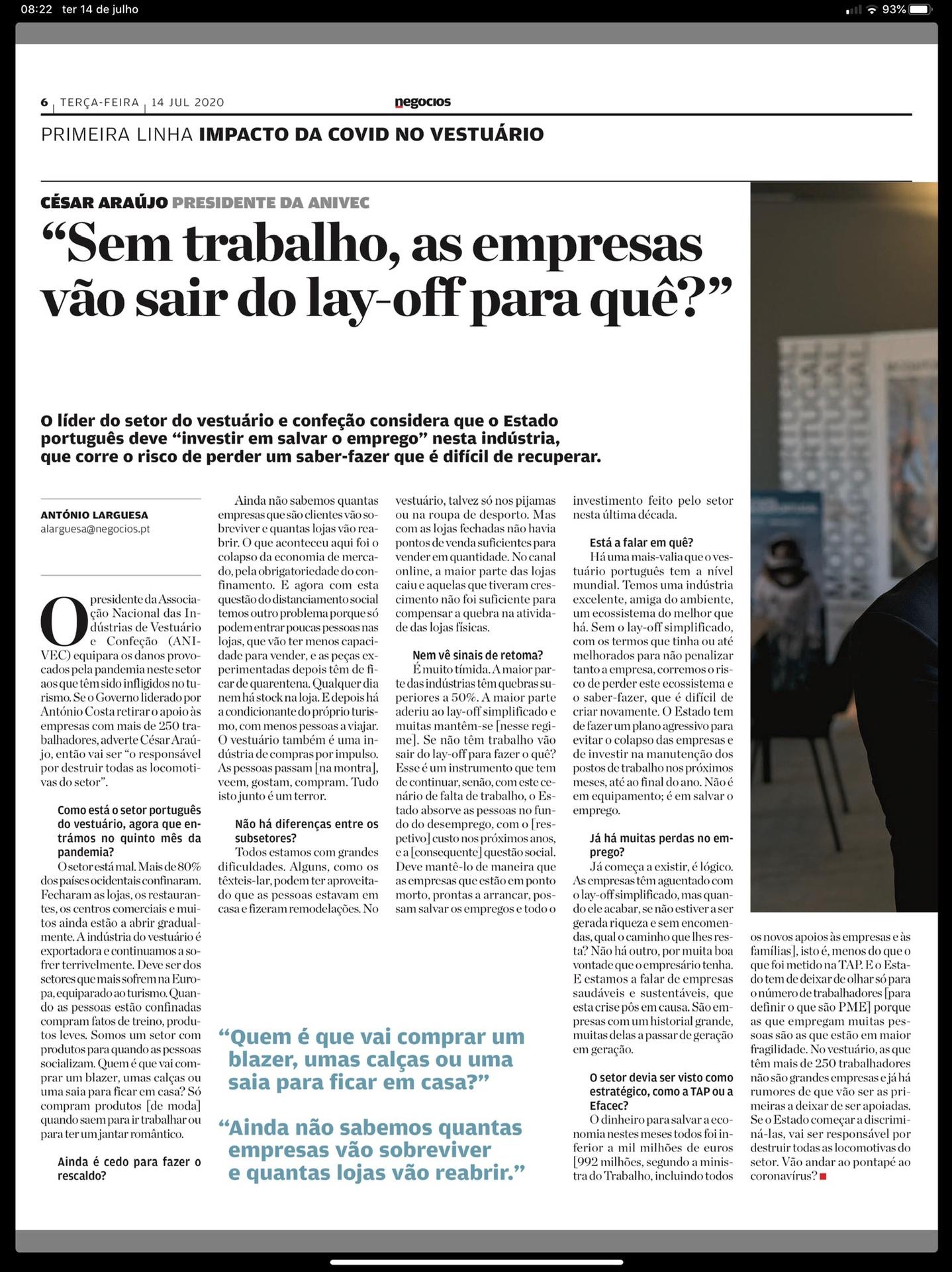No contexto da pandemia provocada pelo COVID-19, o Presidente da ANIVEC, César Araújo, considera que o ano 2020 será um “um ano perdido”. Por toda a Europa, as lojas estão fechadas, os consumidores estão em casa e a compra de roupa é a última das suas preocupações. “Estamos muito mal. O cancelamento de encomendas é uma coisa nunca vista e há casos de clientes a pedir descontos de 50% em alguns produtos que estejam já em produção. Há mercadorias prontas que podem nem chegar ao destino”, diz o presidente da ANIVEC. César Araújo garante mesmo que “há já empresas a fechar portas. Definitivamente”.